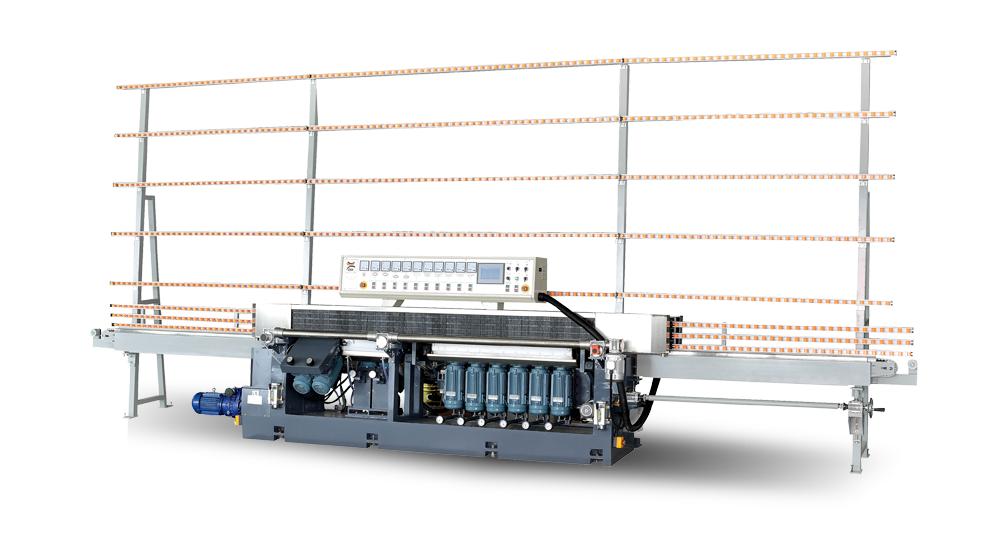 該機采用PLC控制,磨頭電機采用ABB電機,主要用于玻璃底邊及前大倒角磨邊及拋光,其中前面五個馬達角度在0°~45°間任意可調(diào),并在觸摸顯示屏上顯示角度及倒角寬度,自動磨削時可較準確的調(diào)整和設(shè)置前倒角的各項參數(shù)。