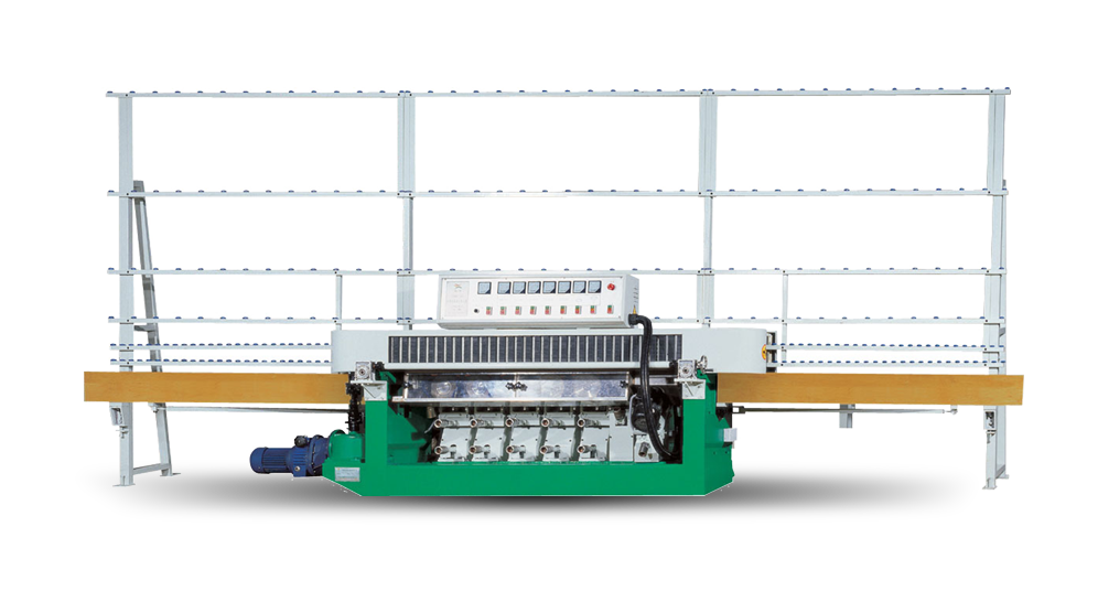 該機用于平板玻璃的圓邊、鴨嘴邊、直邊的磨削和拋光。前導軌可自由平行移動,可磨削不同厚度的玻璃,且在加工圓邊時,前、后倒角磨輪的設置可大大的減輕后面圓邊輪的切削量,及能有效提高磨輪的使用壽命,大大的提高磨削速度。